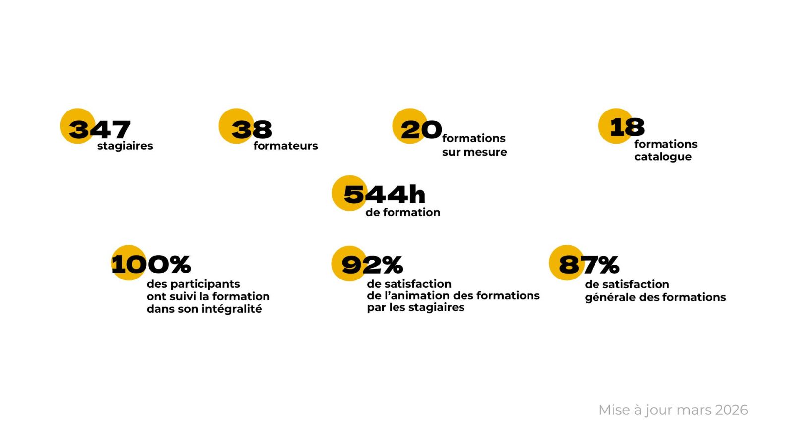 Nous construisons également des formations sur les enjeux actuels en partenariat avec d'autres organismes de formation. Un exemple ? Nous avons imaginé deux modules sur les transitions sociales et écologiques avec le Collectif des festivals et Arviva.